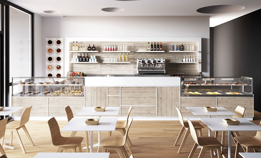 • Zone self-service o buffet: soluzioni pratiche e igieniche con piani di appoggio, vetrine espositive e banchi refrigerati per presentare al meglio le pietanze.
