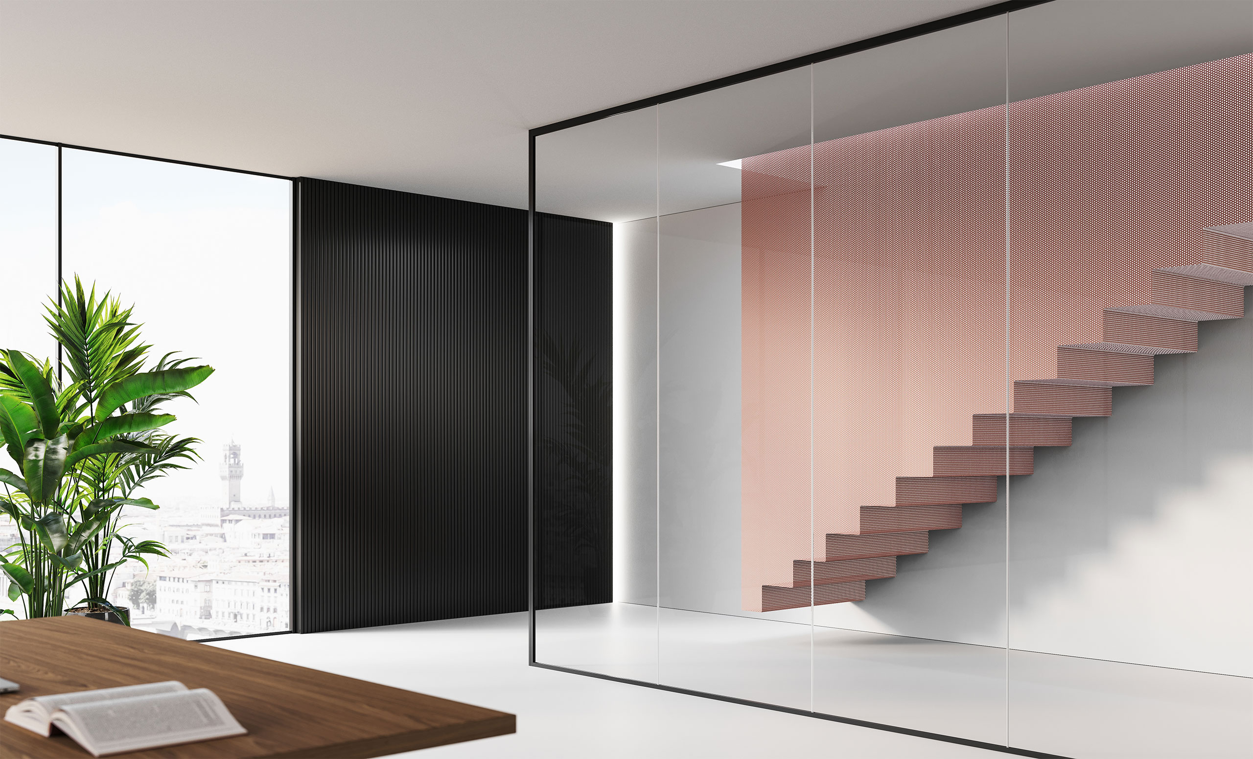 Una parete divisoria in cui i profili fermavetro sono completamente incassati nel pavimento, a soffitto e nelle pareti d’ambito. Una soluzione di grande rigore formale e impegno progettuale che massimizza l’impiego del vetro mettendo in risalto accessori e porte che campeggiano in setti fatti di trasparenza.