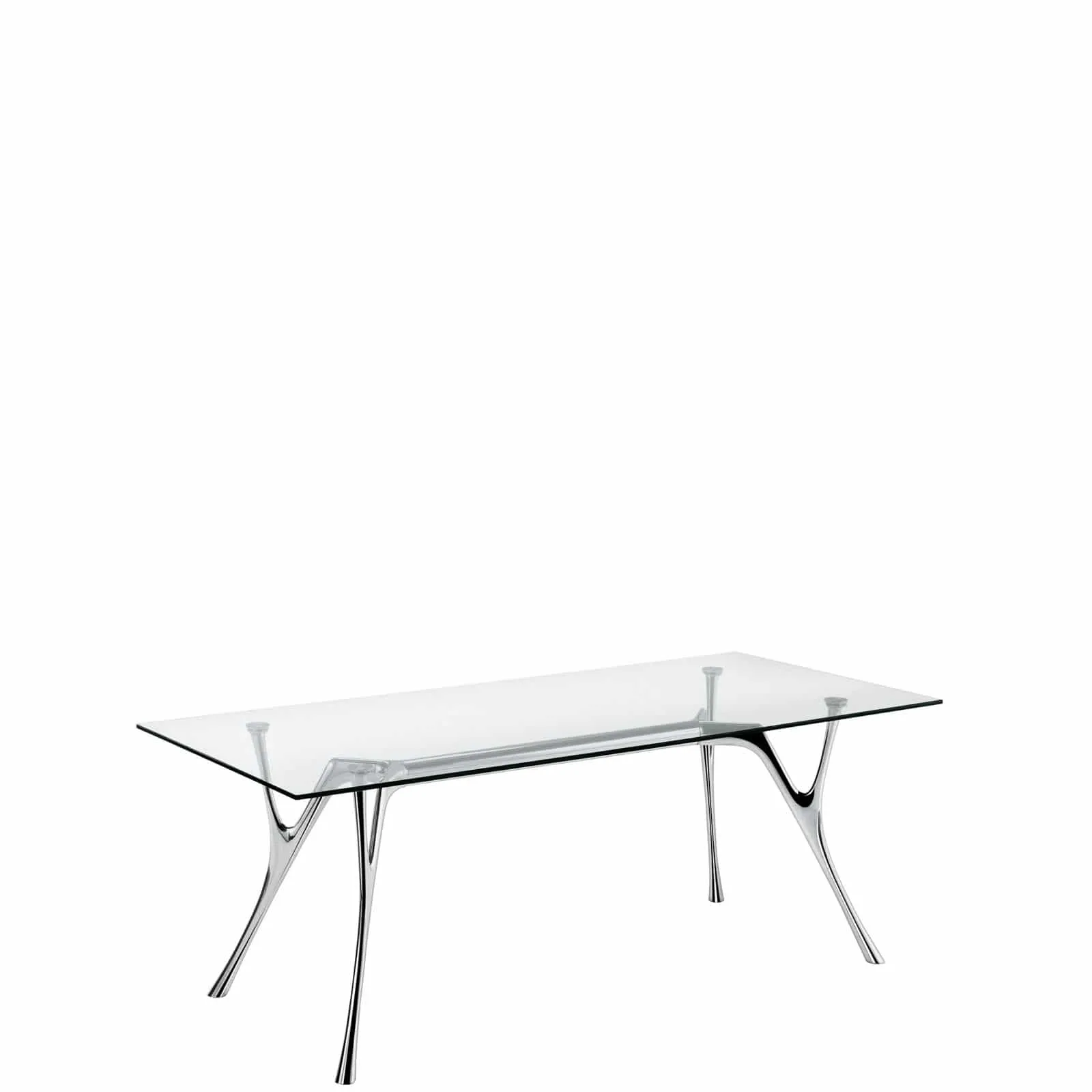 Design rigoroso per il tavolo Pegaso, studiato per raggiungere anche dimensioni importanti e proposto con piano in composito estremamente leggero con struttura a “sandwich” costituito da un’anima in legno listellare, racchiuso tra due lastre di alluminio impiallacciato nella parte superiore e sui bordi perimetrali in rovere chiaro, rovere nero o noce canaletto. Alla semplicità e pulizia formale del piano si contrappongono le forme sinuose della struttura, realizzata in alluminio lucido o verniciato con polveri epossidiche.
